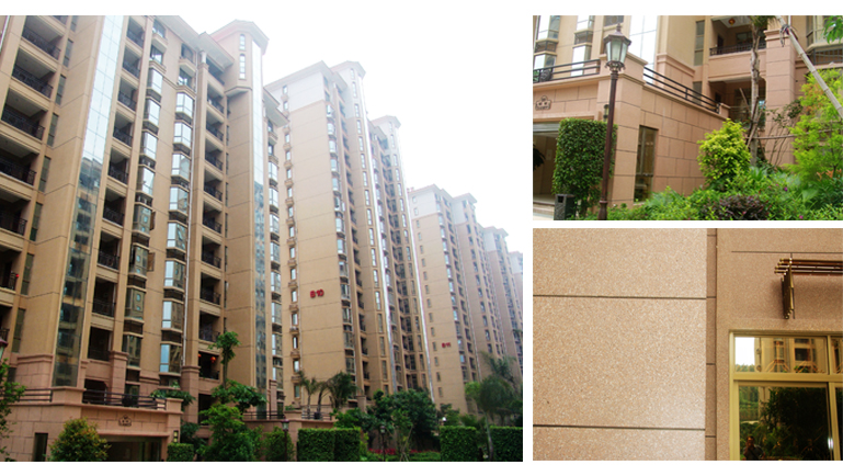花岗岩漆(真石岩片漆)颜色是纯天然彩砂、岩片构成、色泽自然、仿石纹清晰逼真、极富质感,主要应用高档住宅小区外墙涂装。